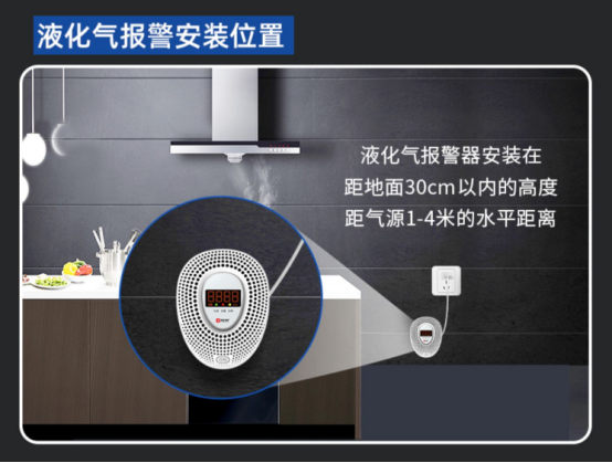 ⑵、當(dāng)檢測(cè)的可燃?xì)怏w為液化石油氣時(shí),考慮到這氣體比空氣重,泄漏后會(huì)停留在空氣下方,因此,報(bào)警器需安裝在距地面0.3-1.0m處,氣源與氣源的距離宜不超過1.5m,以保證檢測(cè)靈敏度。