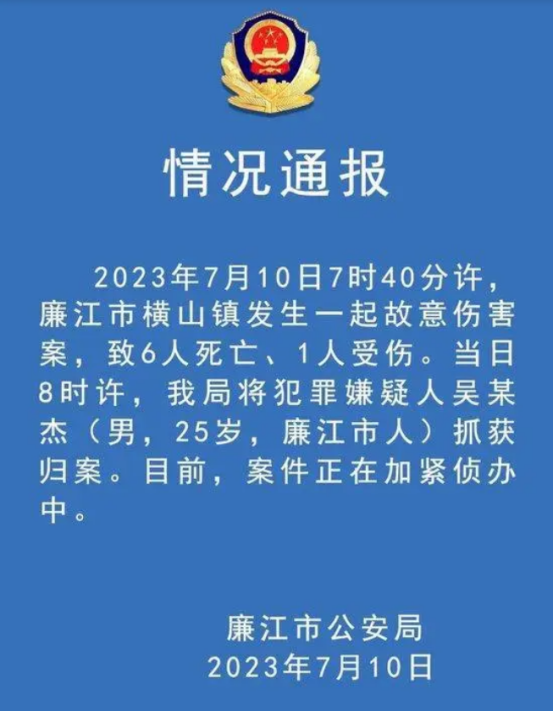 7月10日,廣東省廉江市一所幼兒園發(fā)生故意傷害案。當(dāng)日上午10時(shí)42分,廉江市公安局微信公眾號(hào)“平安廉江”針對(duì)此案發(fā)布情況通報(bào),通報(bào)稱,2023年7月10日7時(shí)40分許,廉江市橫山鎮(zhèn)發(fā)生一起故意傷害案,致6人死亡、1人受傷。當(dāng)日8時(shí)許,廉江市公安局將犯罪嫌疑人吳某杰(男,25歲,廉江市人)抓獲歸案。