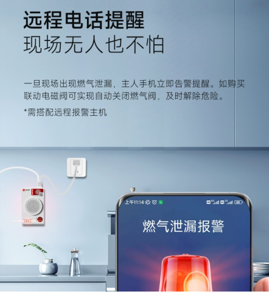 若搭配報(bào)警主機(jī)一起使用,發(fā)現(xiàn)燃?xì)庑孤┏瑯?biāo)后,不僅可以現(xiàn)場高分貝報(bào)警,而且還可通過電話、短信、手機(jī)APP信息等多種方式向用戶遠(yuǎn)程告警。