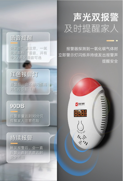 安裝有此設(shè)備的場(chǎng)所,當(dāng)空氣中的一氧化碳濃度超標(biāo)時(shí),就會(huì)對(duì)外發(fā)出智能語(yǔ)音提示音和“嗚嗚嗚”報(bào)警聲,同時(shí)指示燈也會(huì)閃爍。