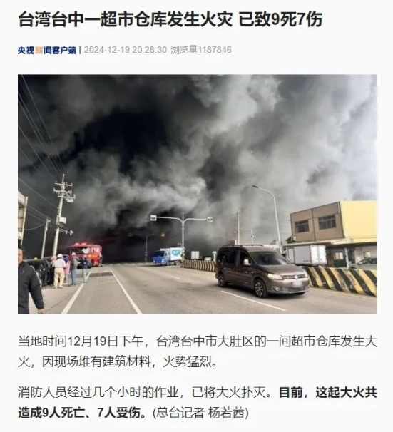 12月19日下午,臺灣臺中市大肚區(qū)一間超市倉庫發(fā)生火災(zāi),因現(xiàn)場堆有建筑材料,火勢猛烈,經(jīng)過消防救援人員緊張?zhí)幹?,明火被撲滅,火?zāi)造成9人死亡、7人受傷。