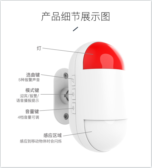 白天當(dāng)家居的門鈴使用時,只要它內(nèi)置的紅外探測器(內(nèi)置或外置的)感應(yīng)到有人時,它就會響起清新的音樂或者親切的迎賓語音,用戶就會知道有客人來訪。
