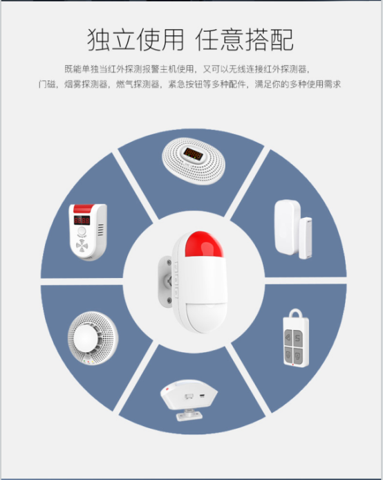如果想全方位的保障家居財產(chǎn)安全和家庭人員人身安全,它還可以連接門磁探測器、燃?xì)庑孤┨綔y器、煙霧探測器、一氧化碳探測器等配件,防止火災(zāi)、燃?xì)獗ā⒚簹庵卸镜仁鹿实陌l(fā)生。