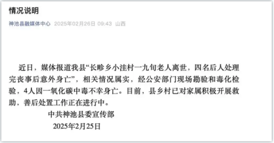 2025年2月26日,山西省忻州市神池縣融媒體中心發(fā)布消息稱:近日,媒體報(bào)道我縣“長(zhǎng)畛鄉(xiāng)小洼村一九旬老人離世,四名后人處理完喪事后意外身亡”,相關(guān)情況屬實(shí),經(jīng)公安部門現(xiàn)場(chǎng)勘驗(yàn)和毒化檢驗(yàn),4人因一氧化碳中毒不幸身亡。目前,縣鄉(xiāng)村已對(duì)家屬積極開展救助,善后處置工作正在進(jìn)行中。